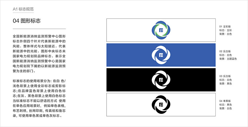 制約新能源消納的關(guān)鍵因素,為新能源的優(yōu)化布局和行業(yè)政策制定提供參考,促進(jìn)我國新能源高質(zhì)量發(fā)展。 藍(lán)藍(lán)設(shè)計(jì)對全國新能源消納監(jiān)測預(yù)警中心的工作范圍做了調(diào)查研究,首先理解業(yè)務(wù)和核心競爭力,之后調(diào)查了行業(yè)相關(guān)品牌標(biāo)志設(shè)計(jì),聽取了大家的期望,之后設(shè)計(jì)出多版logo供選擇。標(biāo)志設(shè)計(jì)確定后進(jìn)行了VI和宣傳冊的設(shè)計(jì)。