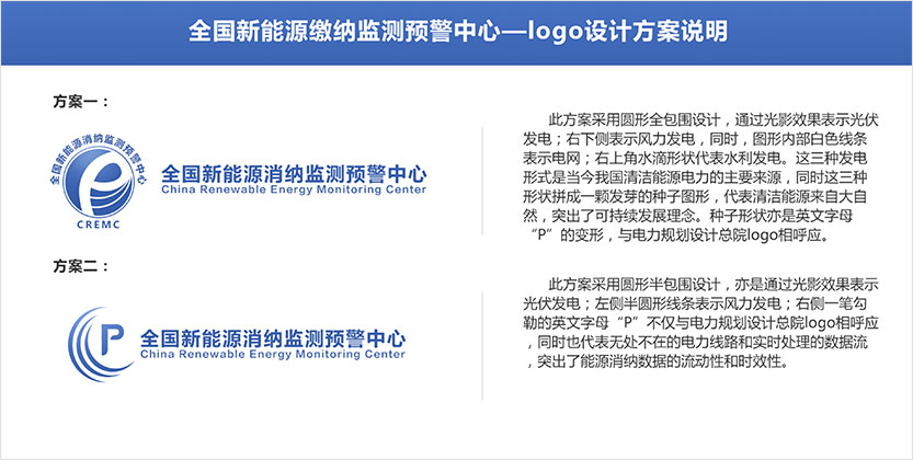 11月5日初次需求調(diào)研提出需求: 1.logo要體現(xiàn)中國電力規(guī)劃總院元素 2.顏色配比與電力規(guī)劃總院保持一致 3.突出風(fēng)電,光伏發(fā)電元素,電網(wǎng)元素和監(jiān)測動(dòng)態(tài)性 4.樣式設(shè)計(jì)要簡潔,沉穩(wěn)大氣,體現(xiàn)專業(yè)性
