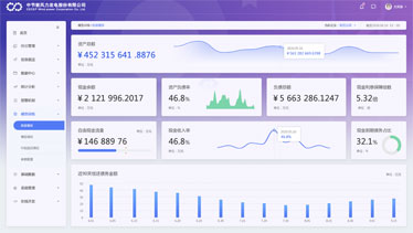 本系統(tǒng)首頁主要是核心數據的總覽和展示,經過與客戶討論,首頁主要顯示“資產”“負債”“現金流”等方面的內容。在確定展示內容之后,藍藍設計嘗試將行業(yè)特色和產品結合,運用情景化的設計,把行業(yè)“風機”融入進首頁中來,同時深色的背景和多種元素的組合,也把科技感體現了出來。