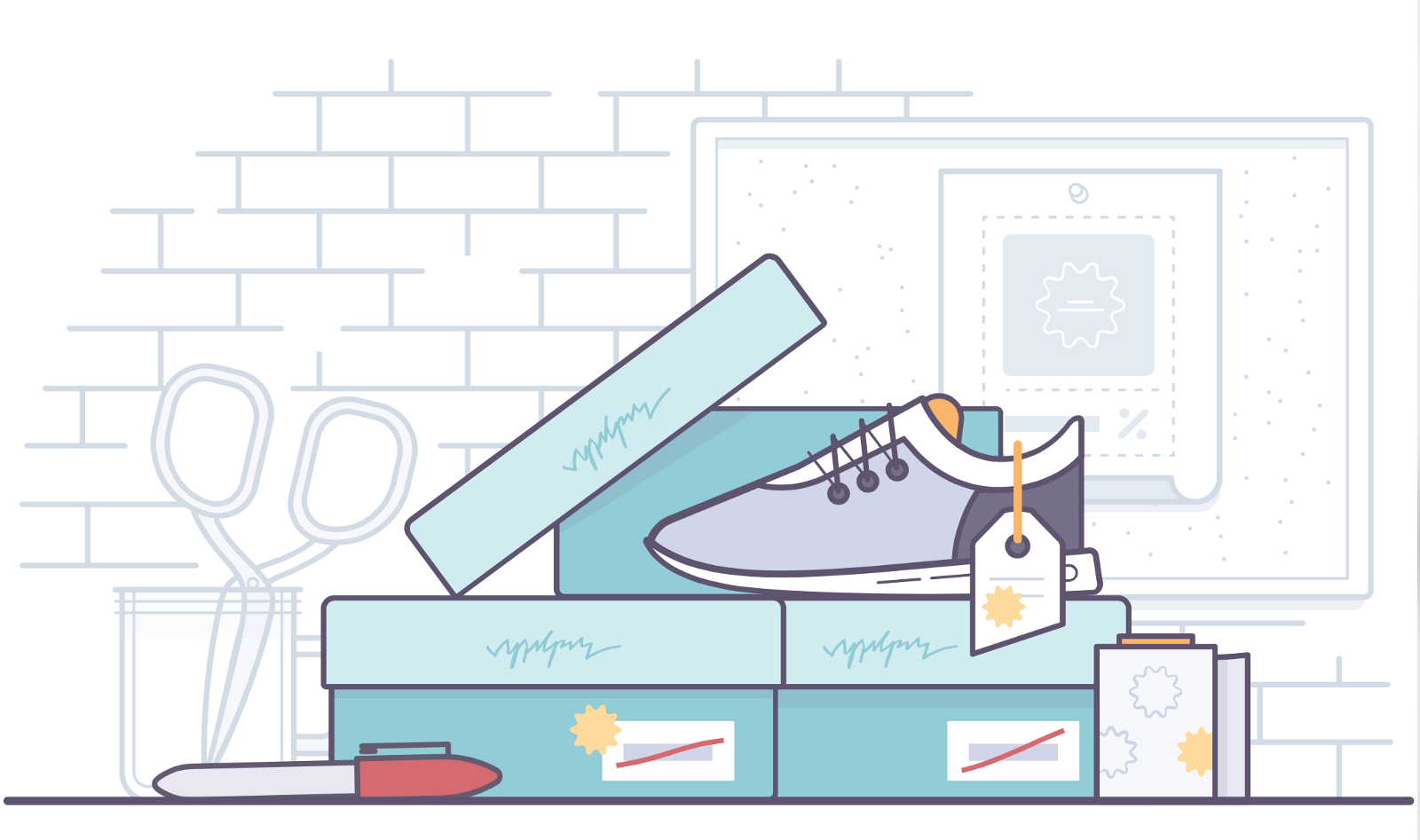 這個元素在線上和線下有相似之處。盡管我不認(rèn)為它是一類比喻,但在產(chǎn)品設(shè)計中我還是將它單獨拿出來說。比喻常用來展現(xiàn)觸動人心的部分,那是一件事情或者一個行動產(chǎn)生的積極感覺。不過,對于內(nèi)容傳遞給用戶的方式,團隊更傾向于中立的寫實表達(dá)。不必告訴用戶我們的感受如何,只需簡潔傳達(dá)信息。用插畫的專業(yè)術(shù)語來表達(dá)則是:我們只愿意通過繪制寫實狀態(tài)下的物品,來幫助用戶理解線上的內(nèi)容。當(dāng)然,談到產(chǎn)品時,我們大多是在電腦上作畫,比如,你可以繪制20多個互相連接的空狀態(tài)頁面,來表達(dá)重復(fù)性。這也是我們在為用戶傳達(dá)內(nèi)容時增加的一種類比方式。比如下圖的例子,線上電子商務(wù)可以讓用戶通過優(yōu)惠碼輸入實現(xiàn)折扣,那么線下實體銷售折扣該如何表達(dá)呢?可能是一堆貼紙和帶著折扣價格的紅色標(biāo)記。我們能借助全新懷舊風(fēng)格的插畫為用戶帶來愉悅,同時還能保持中立,只是簡單清晰的表達(dá)信息。
