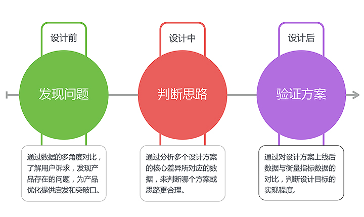 (3)設(shè)計后用于驗證設(shè)計 通過計算上線后的產(chǎn)品數(shù)據(jù),對比設(shè)計前設(shè)定的指標(biāo)數(shù)據(jù),判斷設(shè)計目標(biāo)的實(shí)現(xiàn)程度。