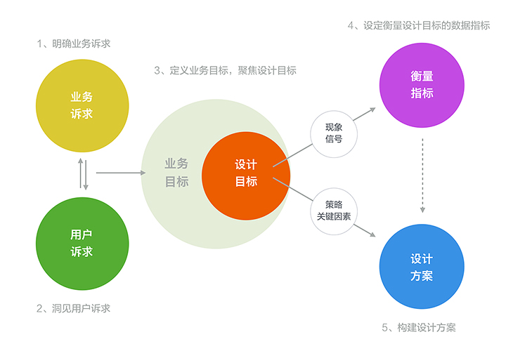 明晰了底層世界觀后,我們團(tuán)隊逐層向上累積出了我們的方法論,包括thinkflow,workflow,等等,其中最具有代表性的就是剛才提到的《五導(dǎo)家》。五導(dǎo)家是一種設(shè)計崗位的思考過程方法論,它包含一個以目標(biāo)用戶為源頭的5步驟思考路徑,及相關(guān)方法和原則,通過深度解構(gòu)+全鏈路串聯(lián)的方式,總結(jié)和表達(dá)作為職能部門的UED團(tuán)隊在設(shè)計工作中思考路徑的普遍規(guī)律,力爭將原來那些模糊、零散的概念信息(如業(yè)務(wù)訴求、用戶訴求、業(yè)務(wù)目標(biāo)等)及思考環(huán)節(jié)(如何從訴求到目標(biāo),如何從目標(biāo)到指標(biāo),如何從目標(biāo)到方案等)進(jìn)行串聯(lián)和體系化。