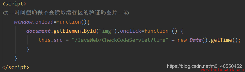 在這里,因?yàn)辄c(diǎn)擊驗(yàn)證碼更換操作需要用到j(luò)s,所以我百度得到了上圖這樣一串代碼。其中時(shí)間戳的作用是通過(guò)改變每次請(qǐng)求的時(shí)間參數(shù)來(lái)獲得刷新效果,即改變url中的響應(yīng)頭信息。