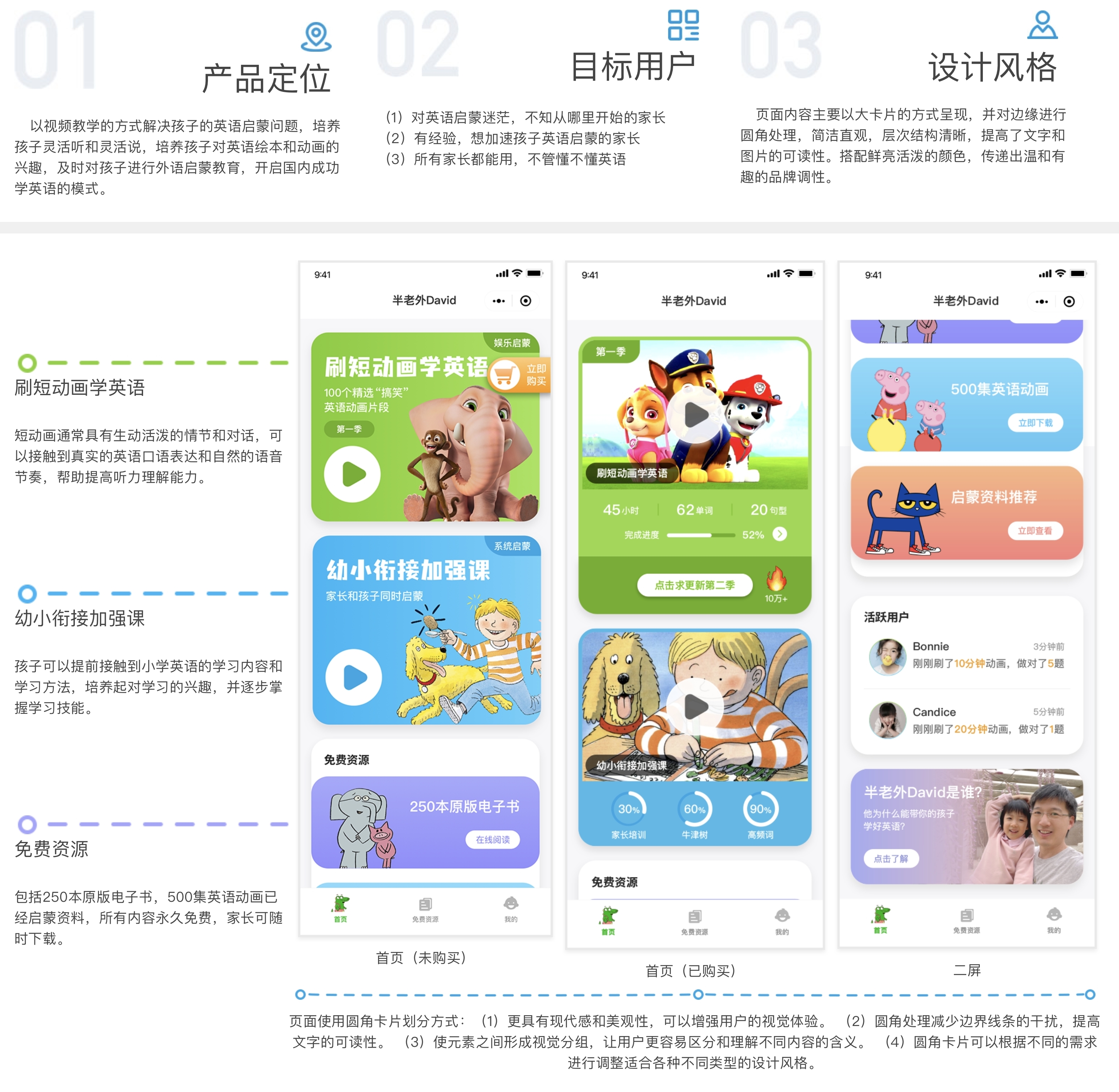 舉例來說,我們曾為一個(gè)名為“半老外 David 英語啟蒙”小程序參與界面與交互設(shè)計(jì)。在這個(gè)面向兒童與家長的英語學(xué)習(xí)產(chǎn)品中,為了提高用戶體驗(yàn)我們進(jìn)行視覺調(diào)整: