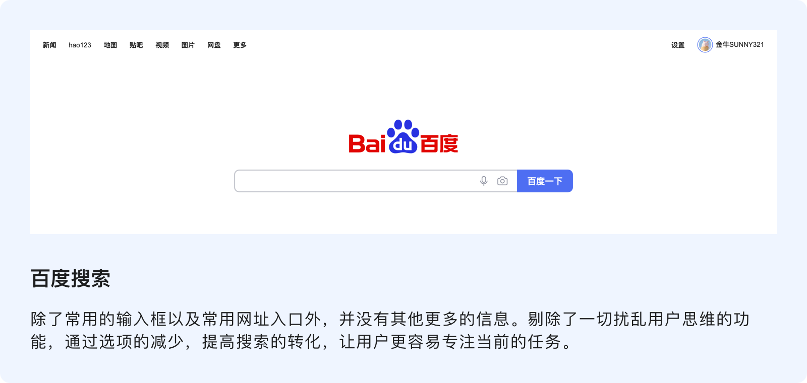 網頁通過大面積的留白營造平和感,通過高反差的對比創(chuàng)造視覺焦點,將必要的信息烘托出來,然后借助留白包圍它們。通過這種方式把核心信息凸顯出來,當用戶進入該搜索頁時,只做必要的事情,關注重要的信息。