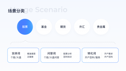 不同場景下用戶需求不同,設計解決方案會有差異,金融品類需求豐富包括股票/基金/期貨/外匯/貴金屬,需求類型包括實體需求/問答需求/轉化需求,需通過數據分析了解各類需求占比,可以作為后續(xù)優(yōu)化優(yōu)先級的判斷指標,經過數據分析后得出結論股票品類需求及用戶占比遠高于其他品類,以股票品類舉例細化用戶需求,列舉搜索詞,便于后續(xù)進行線上問題走查挖掘設計機會點。