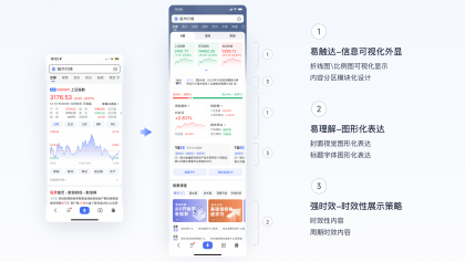 基于小白用戶經驗少、金融垂類專業(yè)知識多晦澀難懂、數據復雜難理解的背景,制定易觸達、易理解2個策略,通過信息可視化外顯、圖表圖形化表達、關鍵信息外顯等方式降低用戶消費門檻,提高信息獲取效率,強時效是基于股票特有的盤前/盤中/盤后周期性交易特征擬定的,可通過此特征打造更加差異化的滿足。
