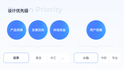 由于開發(fā)資源有限,不能一次做完所有產品設計優(yōu)化,因此需針對優(yōu)化內容排布優(yōu)先級,對高優(yōu)場景進行優(yōu)化,這里的方法是結合用戶分類規(guī)模、產品品類規(guī)模、發(fā)展目標、體驗收益高低明確優(yōu)化優(yōu)先級,通過上述精細化分析得出結論股票場景用戶規(guī)模大,且小白用戶占比高,因此在股票場景下針對偏小白用戶高優(yōu)進行設計優(yōu)化。