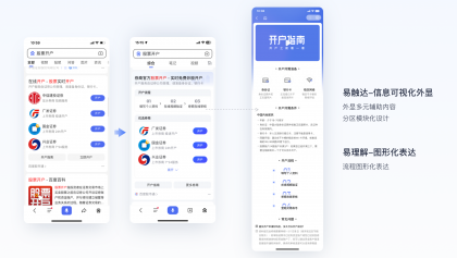 策略設計 :結合用戶需求優(yōu)先級對信息模塊進行分區(qū),可視化外顯優(yōu)先滿足開戶流程需求,再提供優(yōu)質券商開戶入口,考慮到搜索結果頁卡片展示屏效,完整開戶指南配合在落地頁內呈現。