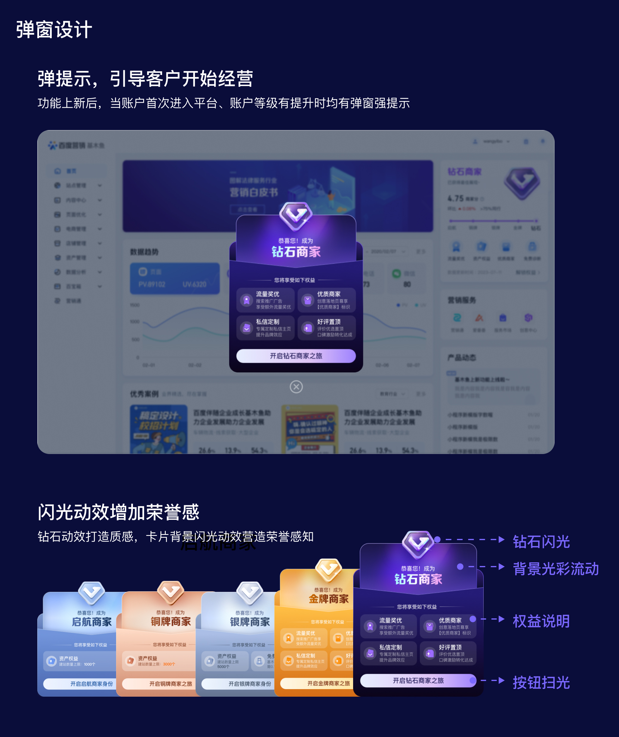 彈窗:作為常見的通知容器,常用于向用戶提供重要的通知、更新、提醒或行動建議。在此項目中,為了增強商家的感知,我們選擇2個場景以彈窗的形式給予商家強提示,一是在功能上線后以彈窗的形式顯示對應等級的信息,以吸引商家的注意力并傳達商家等級的關鍵信息,可以增加商家的感知并引導他們進入商家等級開始經(jīng)營;二是當商家的等級提升時使用彈窗通知,激勵商家持續(xù)經(jīng)營。