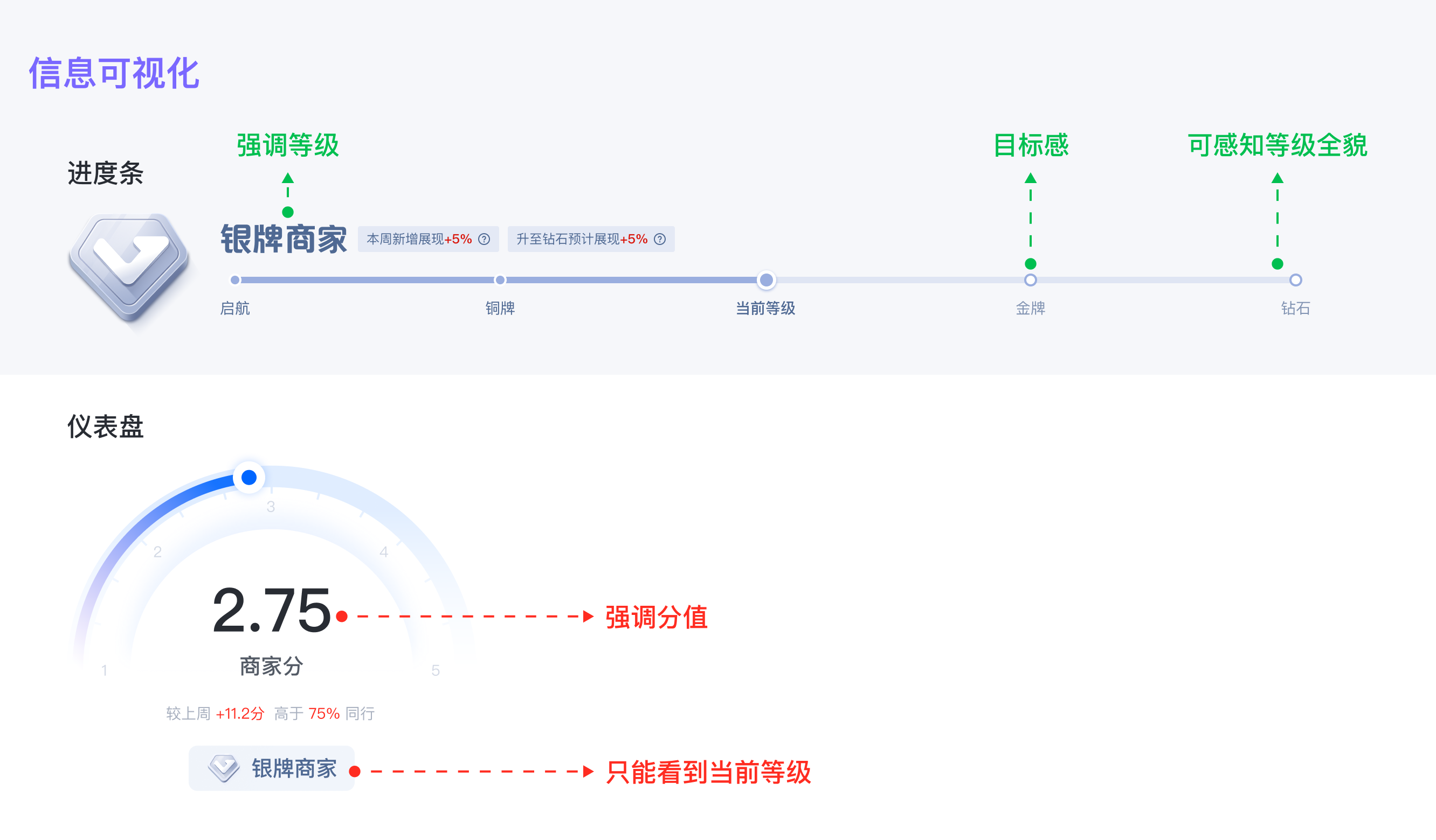 當復雜的信息難以被商家理解時,可視化作為有效手段,旨在把數(shù)據(jù)資料以視覺化的方式表現(xiàn)出,有效地向受眾傳播信息??梢暬紫纫鶕?jù)信息結(jié)構進行圖表選型,在商家等級項目中,我選擇了兩種數(shù)據(jù)圖表(進度條VS儀表盤)來進行商家等級的可視化表達,當兩種圖表放到一起時,可以很明顯的發(fā)現(xiàn)兩者之間的差異,基于這個項目想要強調(diào)的等級概念,最終選擇進度條展示商家等級的成長進度,并激勵其追求下一個等級的提升。這樣,商家能夠準確感知成長進度,衡量自己在商家等級體系里所處的分位以獲取更多成長動力。