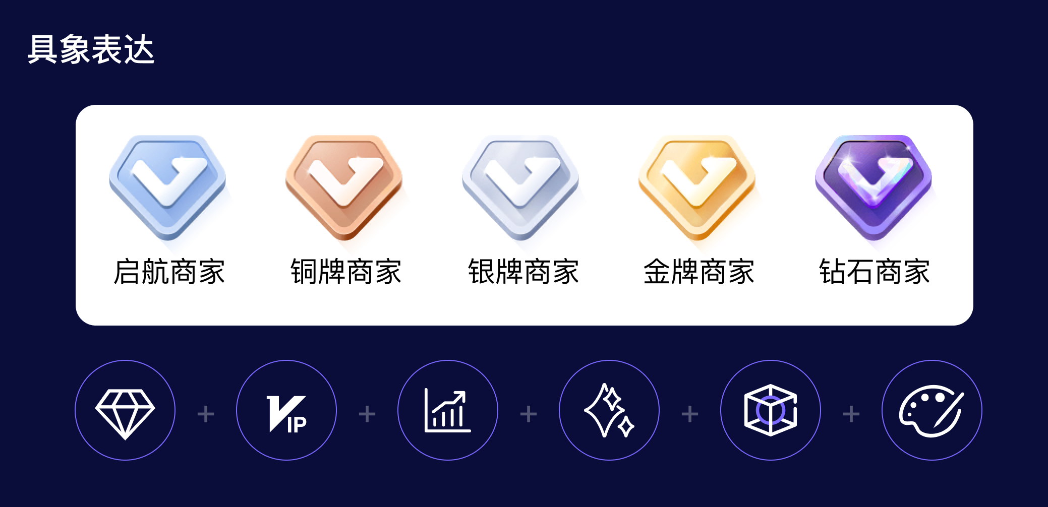 具象表達:有了設計關鍵詞,通過頭腦風暴獲取了一些可以體現(xiàn)這些關鍵詞的具體事物:鉆石、VIP、箭頭、Blingbling、3D、金銀銅等,希望通過具象的事物表達抽象的情緒詞,于是我們從「鉆石」開始入手,把鉆石和VIP、箭頭不斷結(jié)合,同時融入BlingBling,金銀銅色等具有普遍認知的元素,用偽3D效果來增加徽標的立體感,最終打造一種獎牌的形態(tài),給客戶帶來更多榮譽感知,突出商家等級的重要性。