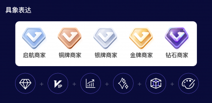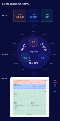 設計的基本出發(fā)點是幫助業(yè)務建設平臺等級模型的表達體系,將業(yè)務目標轉(zhuǎn)化為用戶行為,設計清晰而直觀的商家分層表達體系,將不同商家等級與其對應的特權、服務等信息進行明確的關聯(lián)和傳達,以便商家能夠快速理解和辨識商家等級的差異和優(yōu)勢。