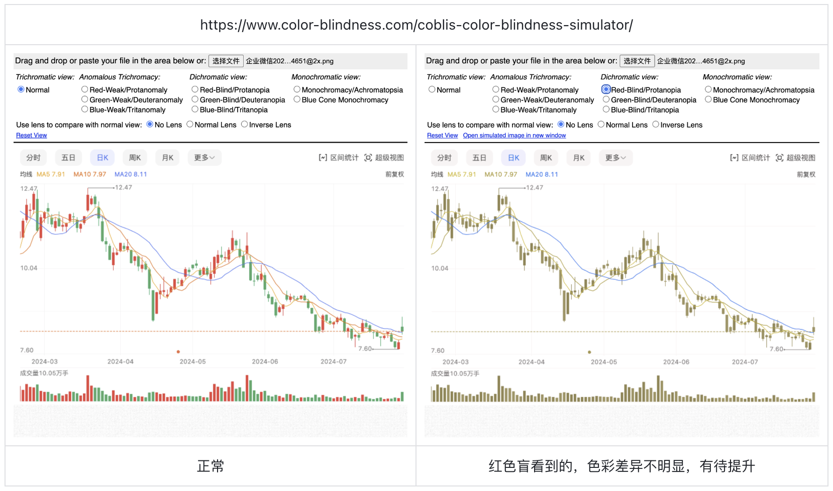 在股票市場中,顏色編碼是信息傳達的重要手段。許多分析工具使用紅色和綠色來表示虧損和盈利,這種直觀的視覺信號對大多數(shù)投資者十分有效。然而,色盲投資者在分析市場動態(tài)時,往往因無法準確分辨這些顏色而產(chǎn)生誤解,影響他們的決策能力。例如,紅綠色盲的投資者在分析股票個股時,可能會混淆紅色和綠色的蠟燭圖,導致錯誤的投資判斷。