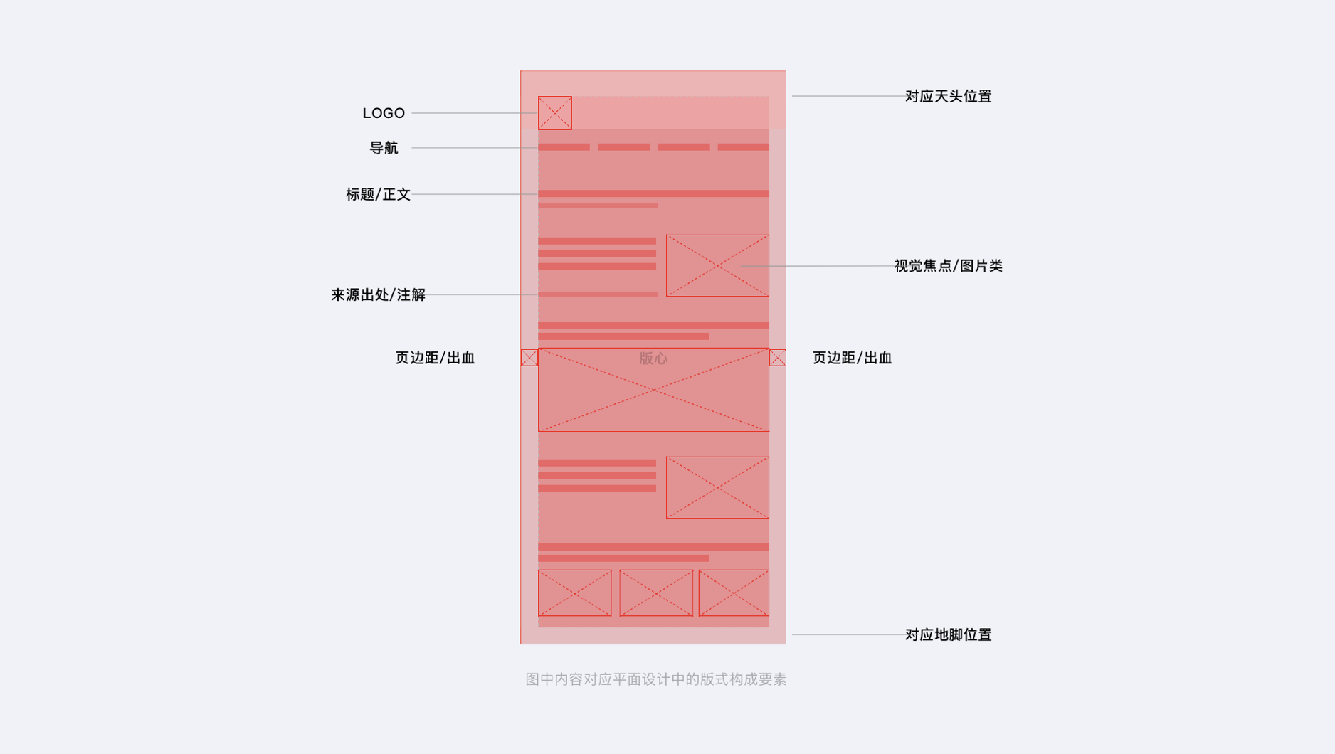 - 空間關(guān)系元素:運(yùn)用平面設(shè)計(jì)中的天頭(LOGO、導(dǎo)航)、版心(標(biāo)題 / 正文、視覺焦點(diǎn))、地腳(來源出處)等結(jié)構(gòu)思考 UI 界面布局,如新聞?lì)惪蛻舳隧撁嬖貙?yīng)分布。