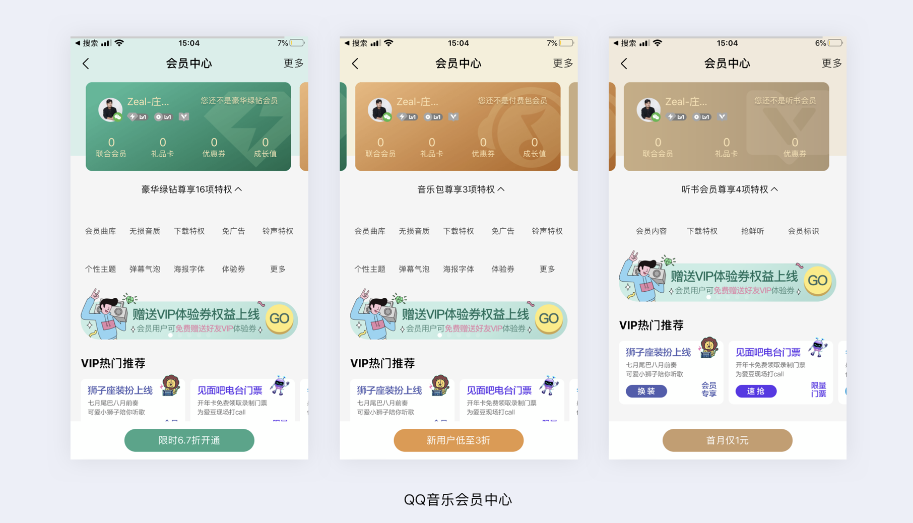 - 圖版率與視覺比重:通過顏色填充背景改變界面專屬比重,引導(dǎo)視覺,如 QQ 音樂會員中心不同等級對應(yīng)不同顏色 card。