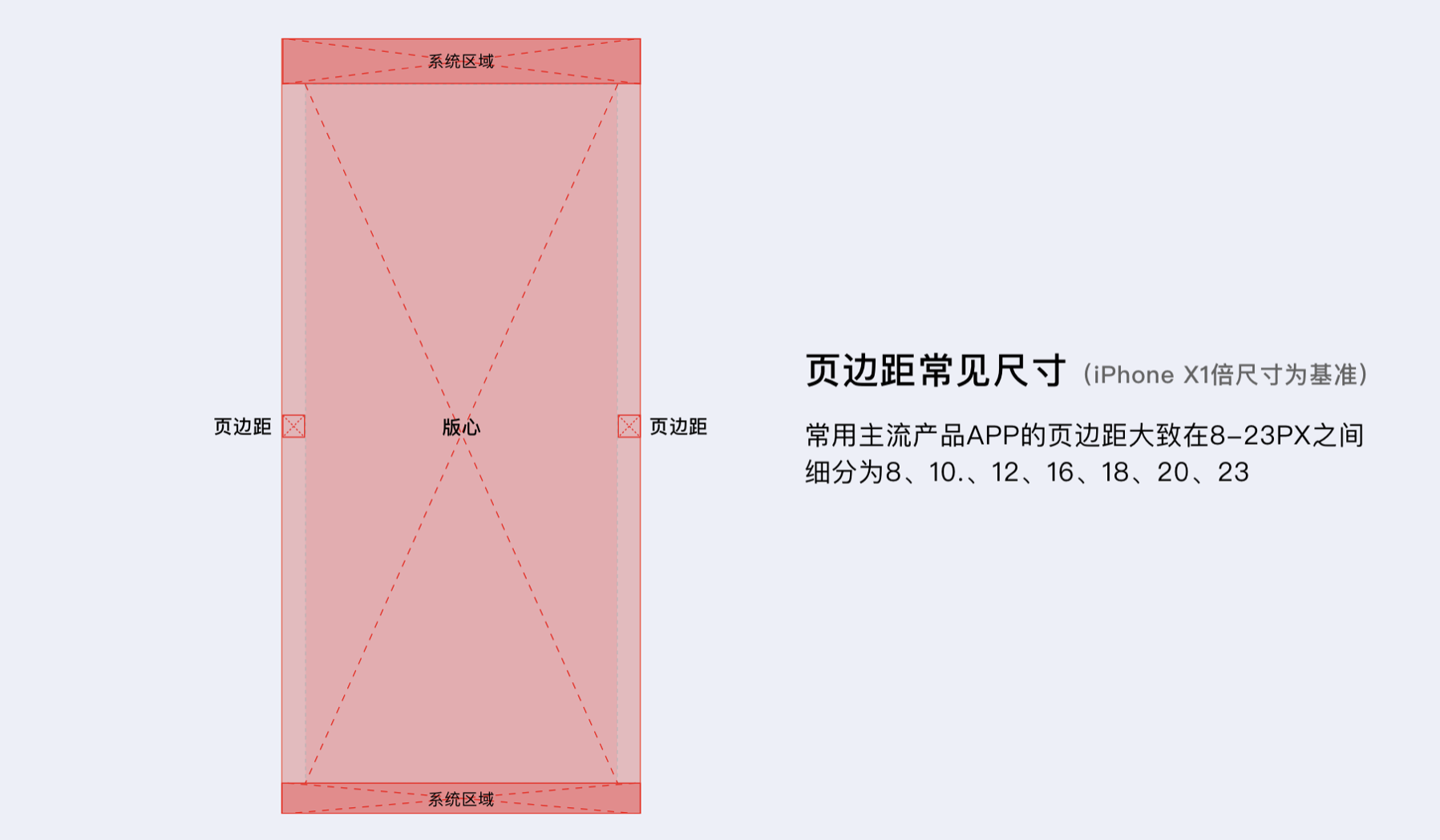- 版心邊距:常用尺寸 8-23PX(以 iPhone X1 倍尺寸為基準(zhǔn)),內(nèi)容多的文字類和購物類產(chǎn)品邊距較小,圖片、視頻類產(chǎn)品邊距較大。