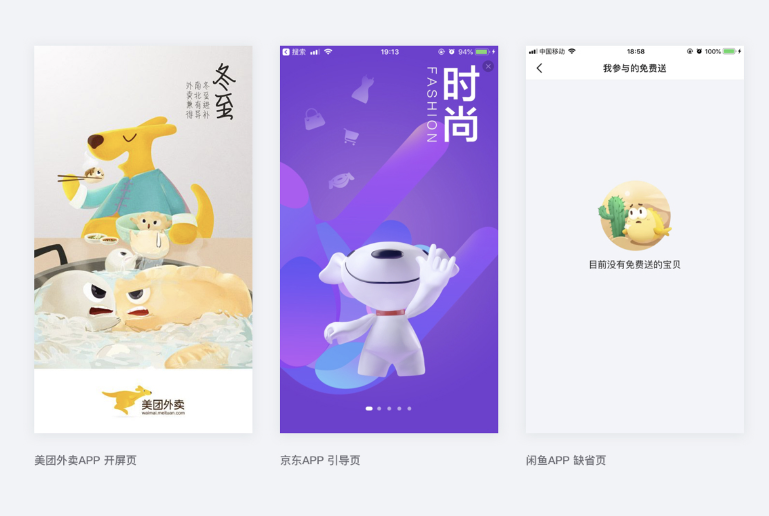 - 獨特的 IP 形象設(shè)計:識別度高的 IP 形象帶給用戶親切感,拉近用戶與產(chǎn)品、企業(yè)的關(guān)系,打造品牌效應(yīng)并延展融入日常生活,如美團(tuán)外賣 APP 開屏頁、京東 APP 引導(dǎo)頁、閑魚 APP 缺省頁等展示企業(yè) IP 形象。