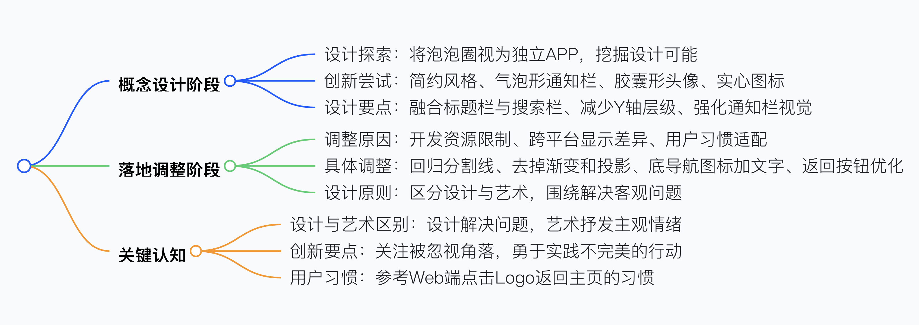 UI 設(shè)計思路應(yīng)先放飛概念探索多種可能,如將泡泡圈視為獨立 APP 進(jìn)行設(shè)計,嘗試簡約風(fēng)格、氣泡形通知欄、膠囊形頭像、實心圖標(biāo)等創(chuàng)新設(shè)計,再結(jié)合實際落實到產(chǎn)品,比如因開發(fā)資源和屏幕顯示限制去掉漸變和彌散投影、回歸分割線和返回按鈕,同時要明確設(shè)計與藝術(shù)的區(qū)別,設(shè)計需圍繞客觀問題解決,概念稿后要提取可用點推動落地,注重用戶習(xí)慣和跨平臺適配,像用愛奇藝 Logo 代替文字返回按鈕。