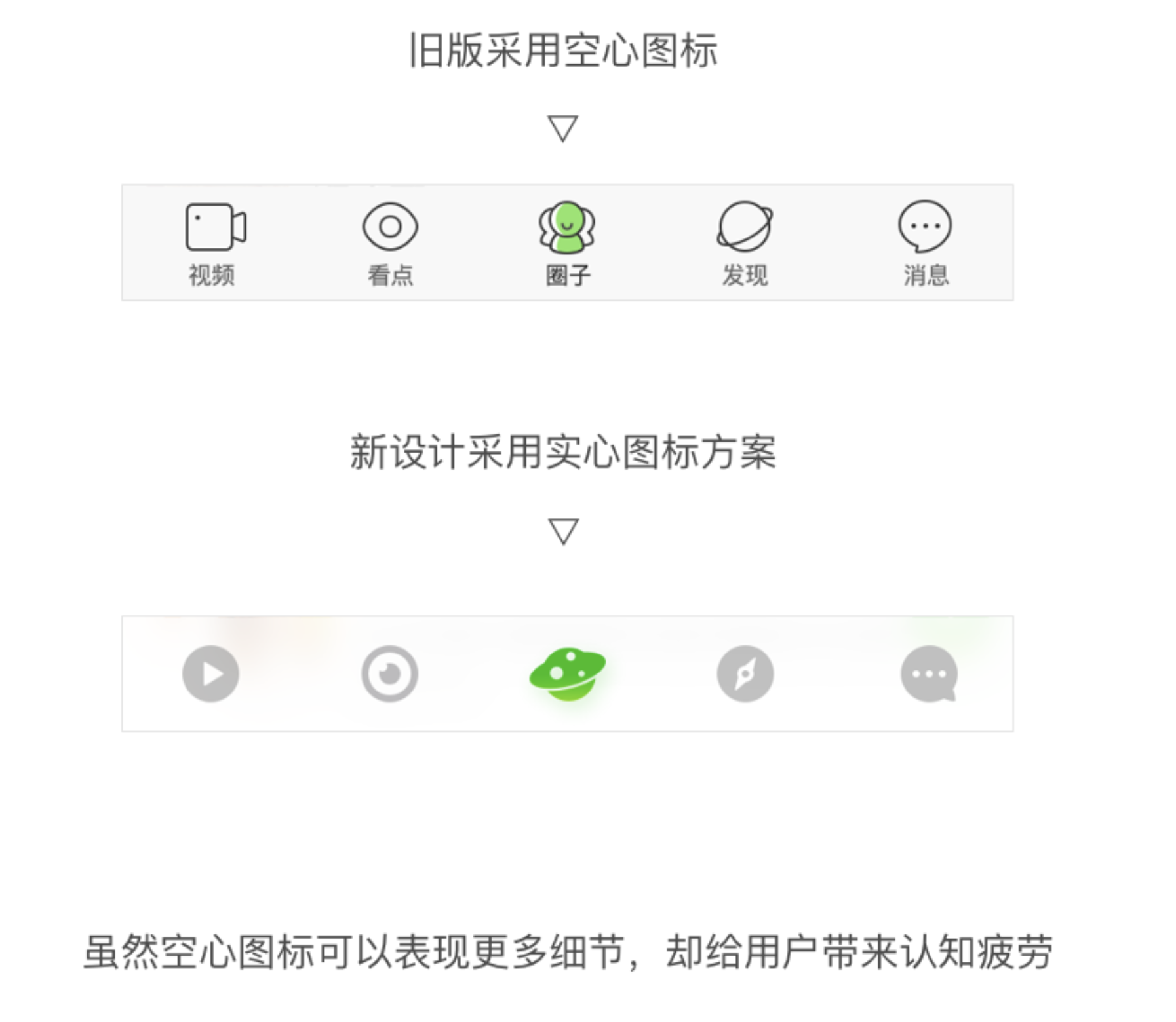 - 圖標(biāo)選擇:采用實心圖標(biāo),依據(jù)國外設(shè)計師 Aubrey Johnson 的 25000 個圖標(biāo)識別實驗,實心圖標(biāo)更符合大眾審美且識別速度更快,如手機 QQ 和 Apple Music 也改用實心圖標(biāo)。