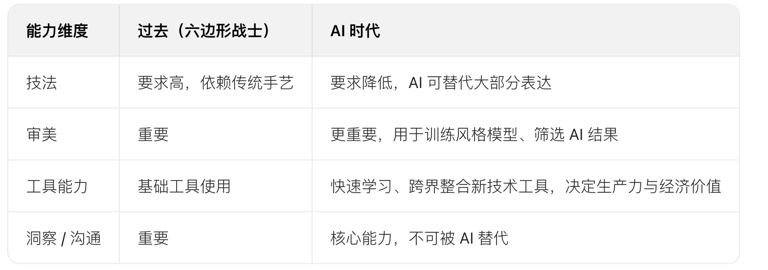 現(xiàn)在:“AI” 木板已達(dá) 100 米,而審美、洞察等其他木板僅 5 米,后者成為能力瓶頸,需重點補(bǔ)齊。