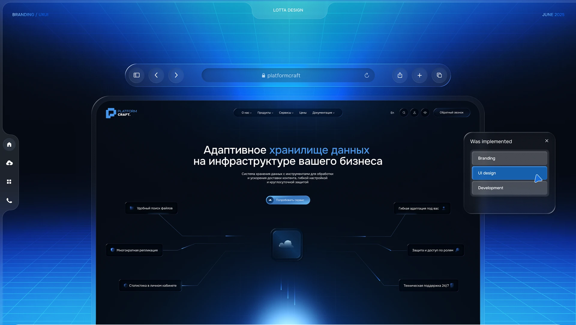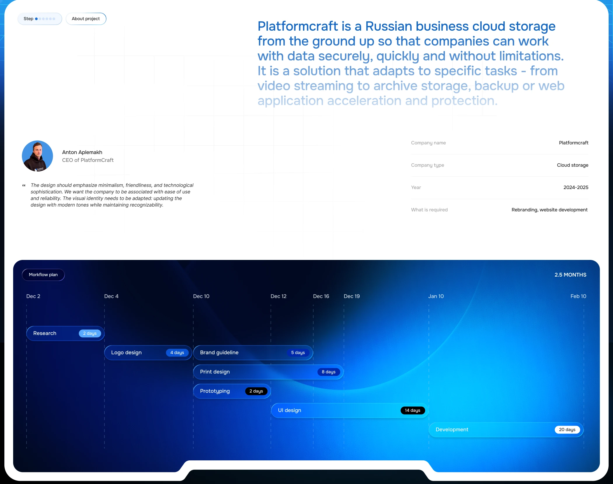Platformcraft 是一款來自俄羅斯的商業(yè)級(jí)云存儲(chǔ)產(chǎn)品,致力于為企業(yè)提供穩(wěn)定、安全且高效的文件管理與協(xié)作服務(wù)。其品牌視覺以字母“P”與云的圖形結(jié)合為核心,簡潔而富有科技感,象征著平臺(tái)(Platform)與云端(Cloud)之間的高度融合。