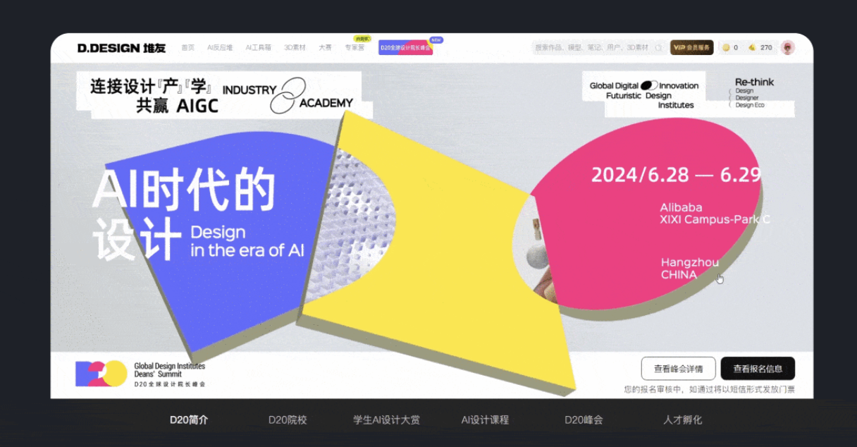 如果 B 端產品缺少體驗設計環(huán)節(jié),其落地呈現(xiàn)的往往只是研發(fā)邏輯,而非用戶需求和心智,無法提供合理的人機交互。體驗設計能打開用戶需求和心智的世界,讓用戶感受到產品是為自己量身定制的。由 Alibaba Design 發(fā)起的 D20 全球設計院長峰會官網首頁設計就很符合用戶心智,畫面簡潔時尚又不失動感,十分耐看。而且人性深處更容易被動態(tài)的事物吸引,下方的導航欄設計也很貼心,在電腦屏幕中完整展示,用戶想查看哪個部分,直接點擊對應的導航欄就能精準跳轉,無需長時間拖拽。