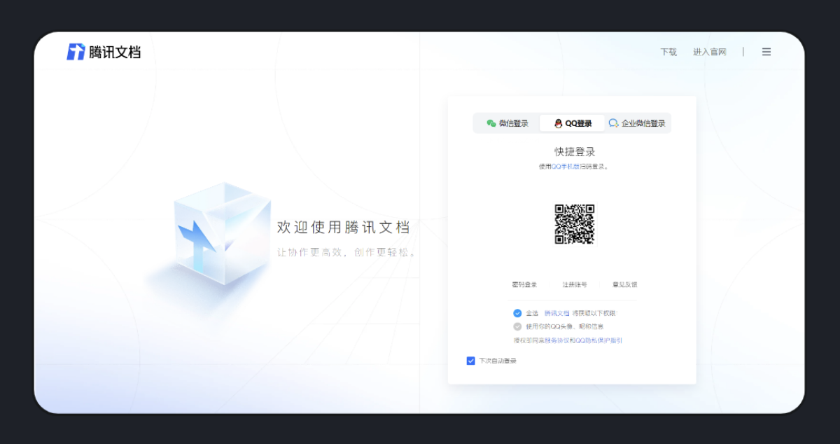 在符合業(yè)務邏輯的基礎上,體驗設計能優(yōu)化 B 端產品復雜的流程,將復雜的迷宮簡化成一條直線,讓用戶操作界面時感到暢通舒適。騰訊文檔的登錄頁沒有讓用戶輸入一連串的賬號和密碼,而是采用二維碼方式,用戶掃碼即可登錄,快捷又方便,大大簡化了登錄流程。