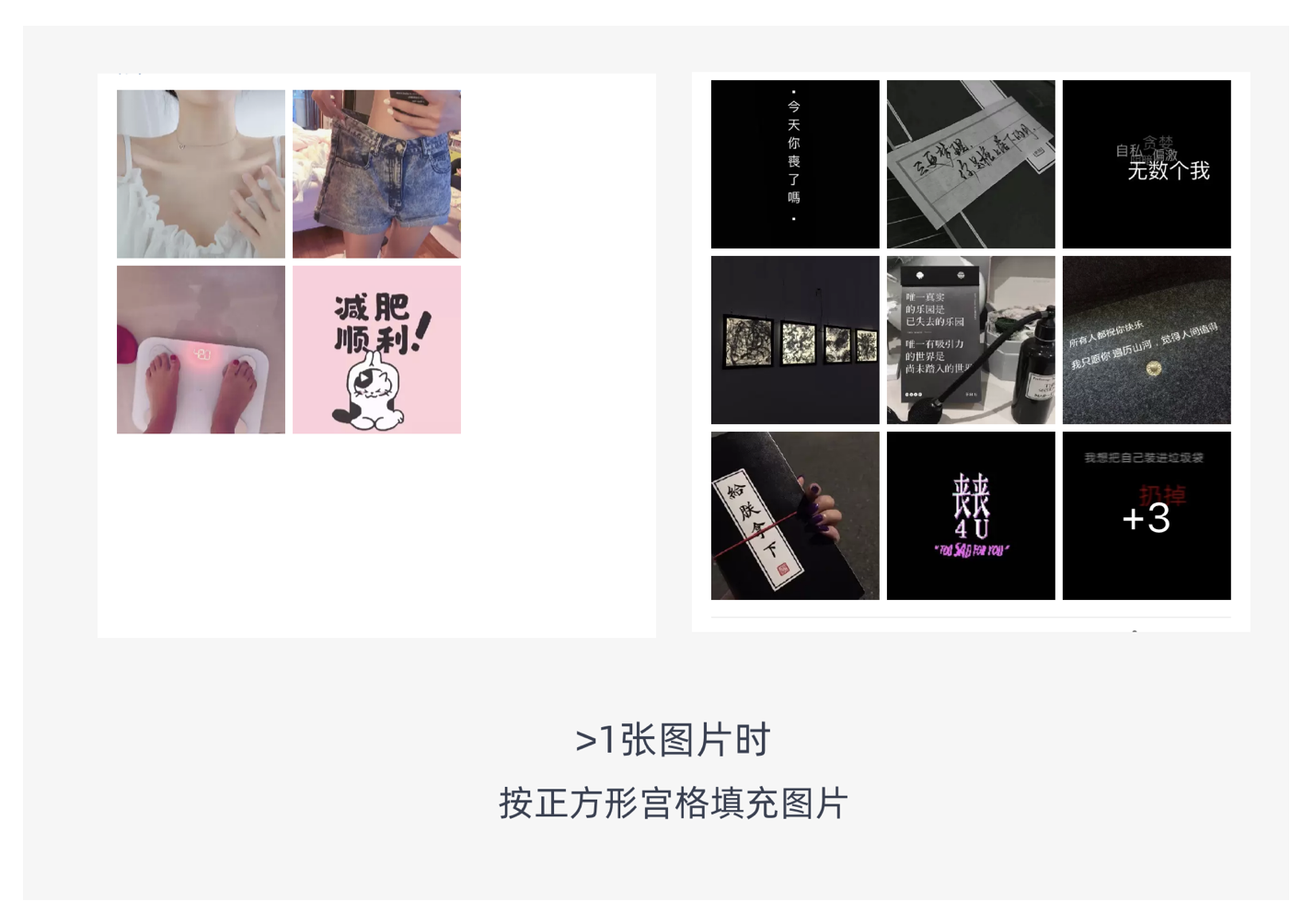 宮格式布局是指用戶上傳的圖片會(huì)適配到一個(gè)個(gè)的方格中,常見(jiàn)的排版有 3 宮格、6 宮格、9 宮格。它多應(yīng)用在社交類的 APP 中或者電商 APP 的內(nèi)容社區(qū),如微博、微信、QQ 空間等社交 APP,以及淘寶等電商應(yīng)用的內(nèi)容社區(qū)。