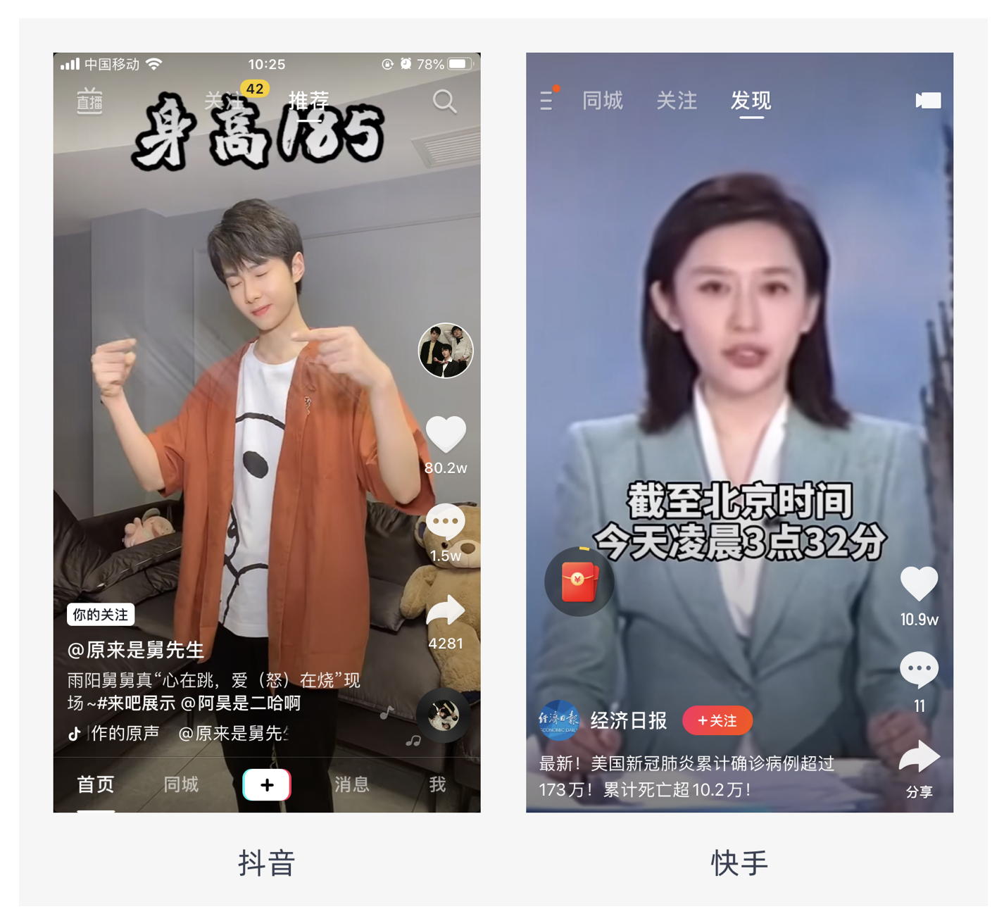 視頻性 Feed 流以短視頻為主(長(zhǎng)視頻占用用戶時(shí)間長(zhǎng),容易導(dǎo)致用戶缺乏耐心),搭配輔助文字。它的優(yōu)點(diǎn)是能滿足用戶在視覺(jué)和聽(tīng)覺(jué)上的感受,沉浸式體驗(yàn)好,更加容易吸引用戶的注意力,一般情況下會(huì)主動(dòng)且循環(huán)播放,畫面占滿全屏,如快手、抖音、微視等。不過(guò),它也存在缺點(diǎn),占用空間大,展示內(nèi)容少,而且需要緩存,對(duì)網(wǎng)絡(luò)質(zhì)量要求高。