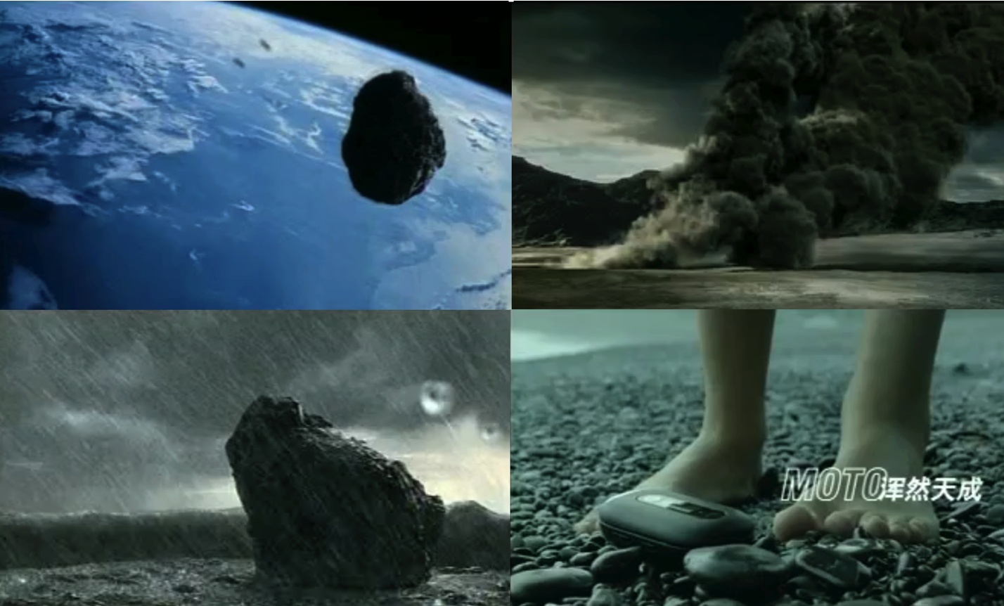 想到這里,我記得個(gè)人非常喜歡MOTO的一款手機(jī)U6,它的廣告也同樣精彩:一塊太空隕石轟然墜落大氣層,歷經(jīng)風(fēng)吹日曬、雨雪凌虐,在歲月洗禮中,滄海桑田,最后成為沙灘上一顆圓滑的黑色鵝卵石,一個(gè)美女撿起打開(kāi),聲音響起:Hello Moto!