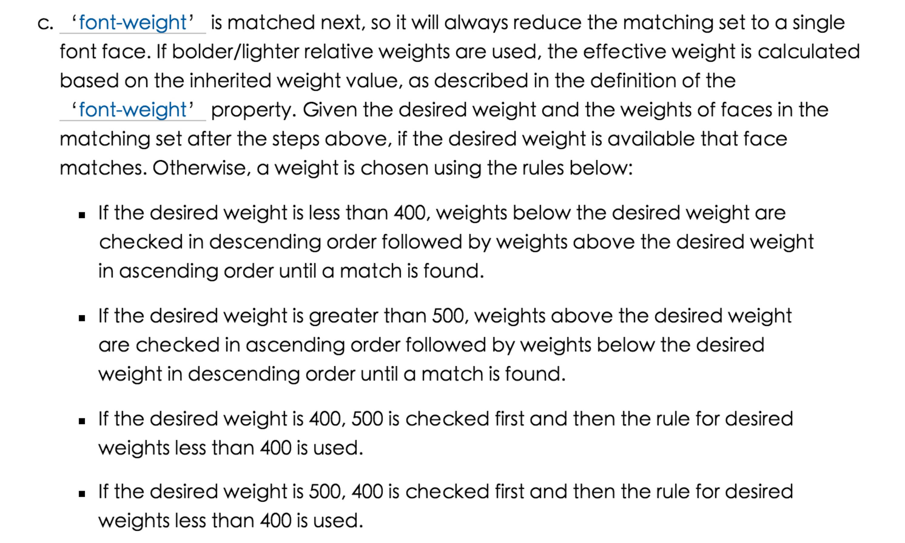 為什么呢?根據(jù)結(jié)果表現(xiàn),我們可以反推出,字重在瀏覽器去渲染時早已經(jīng)按照算法去一一匹配好。也就是,400匹配的字重在500匹配之前已經(jīng)匹配好了(說起來有點拗口,大家可以根據(jù)Figure.16的例子體會下)。