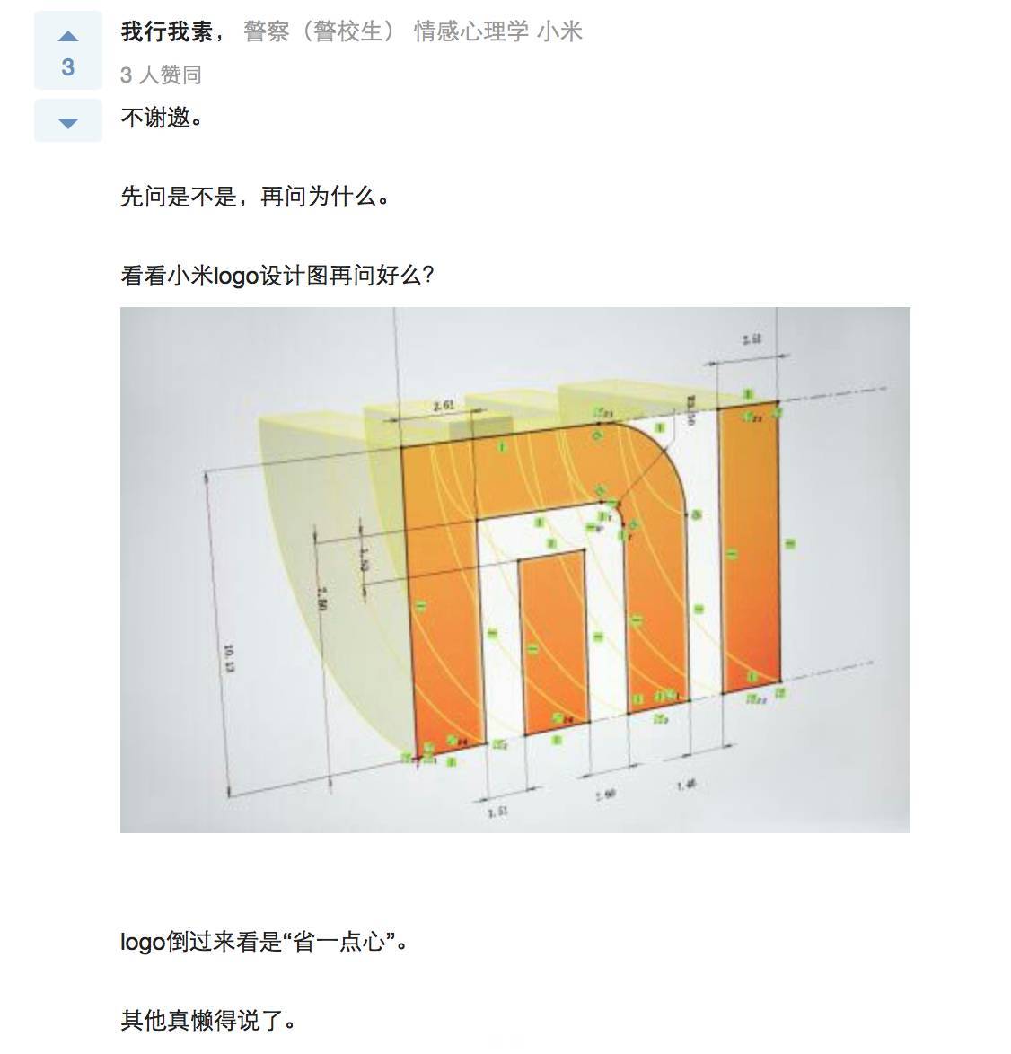即便小米的LOGO當年剛發(fā)布的時候還是有抄襲或是撞車嫌疑,但從截圖回復來看,小米公司內(nèi)部還是對這個LOGO認可, 但我不覺得在設計之初,設計師就知道他設計的LOGO倒過來還能扯上“心”這個層面的意思。