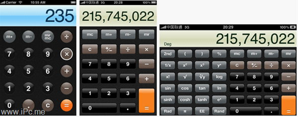 iPhone游戲里出現(xiàn)橫豎屏設(shè)計(jì)比較正常,都是視具體的游戲類型來(lái)分。但一般的效率型應(yīng)用或?qū)嵱霉ぞ撸彩菣M豎屏都有。林子大了,什么鳥都有,有 些用戶就是喜歡經(jīng)常將屏幕旋轉(zhuǎn)過(guò)來(lái),而且還不在少數(shù)。他們或是喜歡橫屏的瀏覽方式(如備忘錄、音樂(lè)),或是希望打橫可以看到更多的信息(如計(jì)算器)。設(shè)計(jì) 的時(shí)候必須充分考慮用戶的期望。有時(shí)將界面內(nèi)容旋轉(zhuǎn)就可以簡(jiǎn)單滿足他們的需求,但有時(shí)也需要你重新去設(shè)計(jì)以展示更多的內(nèi)容(如橫屏的音樂(lè)會(huì)出現(xiàn)一個(gè)新的界 面,展示所有的歌曲)。