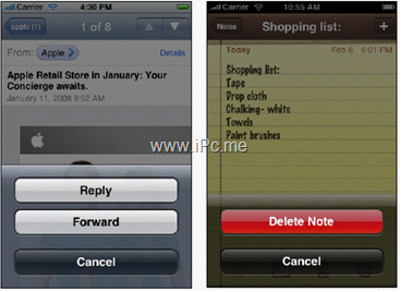 屏幕的底部一般是輔助性的工具欄或切換視圖使用的頁(yè)簽欄。一些影響較大的操作如果出現(xiàn)在屏幕下半?yún)^(qū)域,必須仔細(xì)考慮它們的排列設(shè)計(jì)。如圖5.1,一 般情況下,操作面板的取消按鈕放在最后,這樣可以鼓勵(lì)用戶閱讀完所有的選項(xiàng),暗藍(lán)色的返回按鈕可以和一般的按鈕區(qū)分開來(lái),即便用戶沒(méi)閱讀完也知道這是返回 按鈕。對(duì)于一些影響較大的操作(如刪除),將其放在面板的頂部是最好的,因?yàn)轫敳扛菀妆豢吹?,再加上紅色的警告暗示,用戶選擇起來(lái)會(huì)更為慎重。