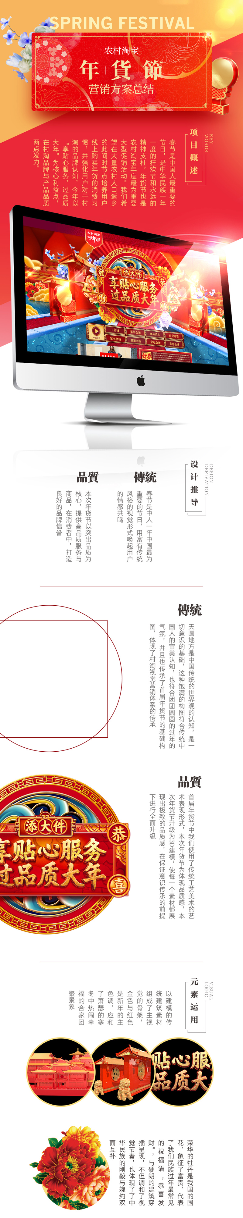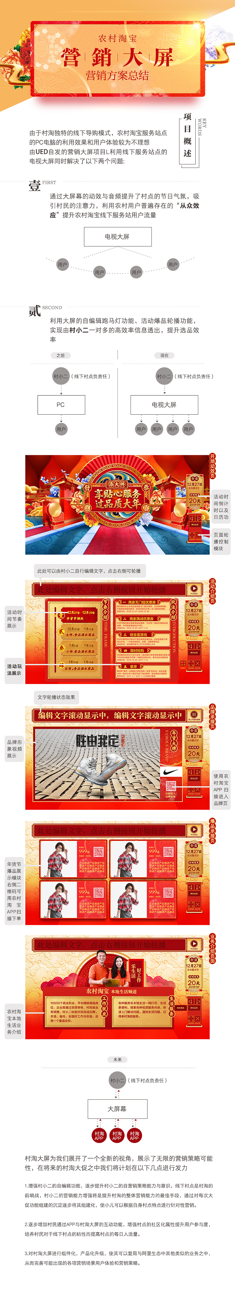 元旦已立,新春即臨,這是中國人最重要的傳統(tǒng)節(jié)日,也代表了農(nóng)村淘寶年度最為重要大型促銷活動年貨節(jié)的即將上線。我們在本次大促之中除了完成常規(guī)的需求之外也進行了多項創(chuàng)新性嘗試與自發(fā)的創(chuàng)新項目,包括針對線下營銷場景特點的視頻制作,創(chuàng)新大屏的全新功能上線等等。
