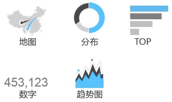 分析清楚數(shù)據(jù)后,就要找個(gè)合適的箱子把這些“蘋果”裝進(jìn)去。上一步,或許還可以靠自身的邏輯能力,采集到的現(xiàn)成數(shù)據(jù)分析得到,而這一步更多地需要經(jīng)驗(yàn)和閱歷。幸運(yùn)的是,現(xiàn)在已經(jīng)有很多成熟的圖形可以借鑒了。從和業(yè)務(wù)的溝通了解到,需要匹配的圖形有中國地圖、餅圖、top圖、數(shù)字、趨勢等。