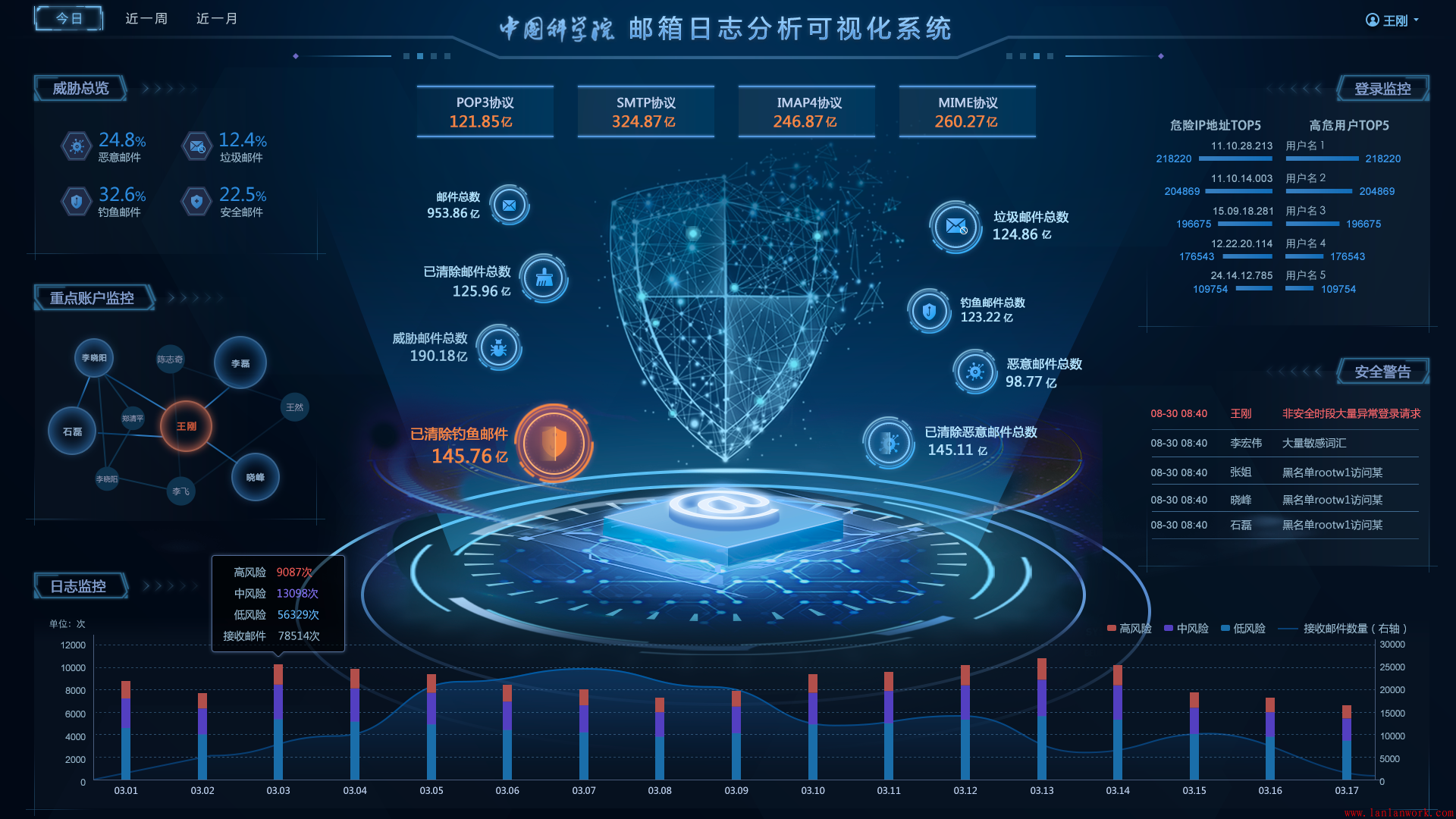 藍(lán)藍(lán)設(shè)計(jì)也在給中科院各個(gè)院所設(shè)計(jì)界面,上圖是給郵箱日志分析可視化系統(tǒng)設(shè)計(jì)的界面概念稿。為了設(shè)計(jì)好,我們搜集了各種資料文章和行業(yè)界面參考,了解郵件系統(tǒng)的行業(yè)術(shù)語,畫出交互原型、視覺設(shè)計(jì)稿。