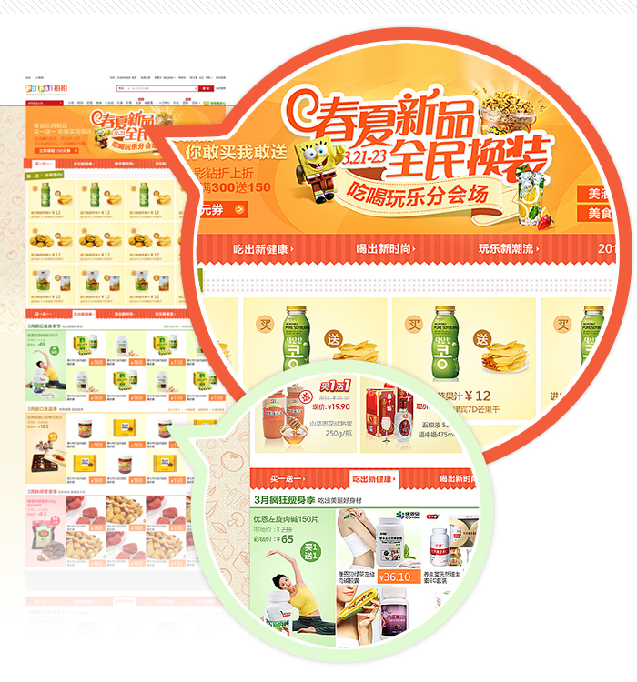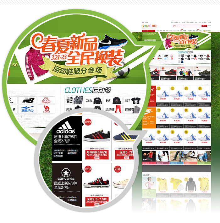 拍拍3月的大型促銷活動《春夏新品,全民換裝》,主會場設(shè)計上運(yùn)用明快、鮮艷的春夏色彩塊組合,在細(xì)節(jié)上采用花朵草地藍(lán)天更加突顯初春購物的輕松氛圍。并在活動頭部主畫面中采用HTML5+CSS3實(shí)現(xiàn)的酷炫動畫,為用戶帶來了全新的頁面體驗(yàn)。