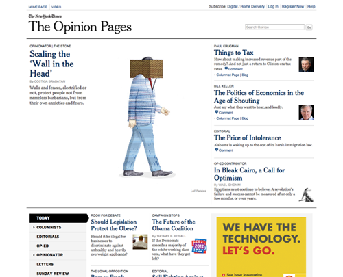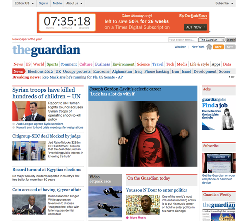 對(duì)于在線雜志或報(bào)紙一類需要呈現(xiàn)大量?jī)?nèi)容的網(wǎng)站來(lái)說(shuō),要打造簡(jiǎn)潔的頁(yè)面設(shè)計(jì)方案則更加困難。不過(guò)英國(guó)的衛(wèi)報(bào)(The Guardian) 以及一些同類型的在線報(bào)紙站點(diǎn)倒是向我們展示了通過(guò)固定寬度的網(wǎng)格布局實(shí)現(xiàn)簡(jiǎn)潔設(shè)計(jì)方案的可行性: