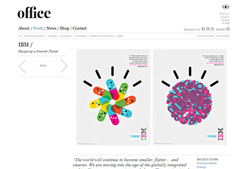 舉例來(lái)說(shuō),IBM的智能星球運(yùn)動(dòng) (Smarter Planet campaign)涉及到多個(gè)方面的主題,與其相關(guān)的印刷品、插畫、圖表、人機(jī)互動(dòng)素材等都遵從著同一套方案標(biāo)準(zhǔn),包括幾何框架、線條風(fēng)格、色彩飽和度等。無(wú)論是在網(wǎng)站,還是在平面媒體中,相關(guān)主題的視覺(jué)表現(xiàn)形式都具有高度的一致性。