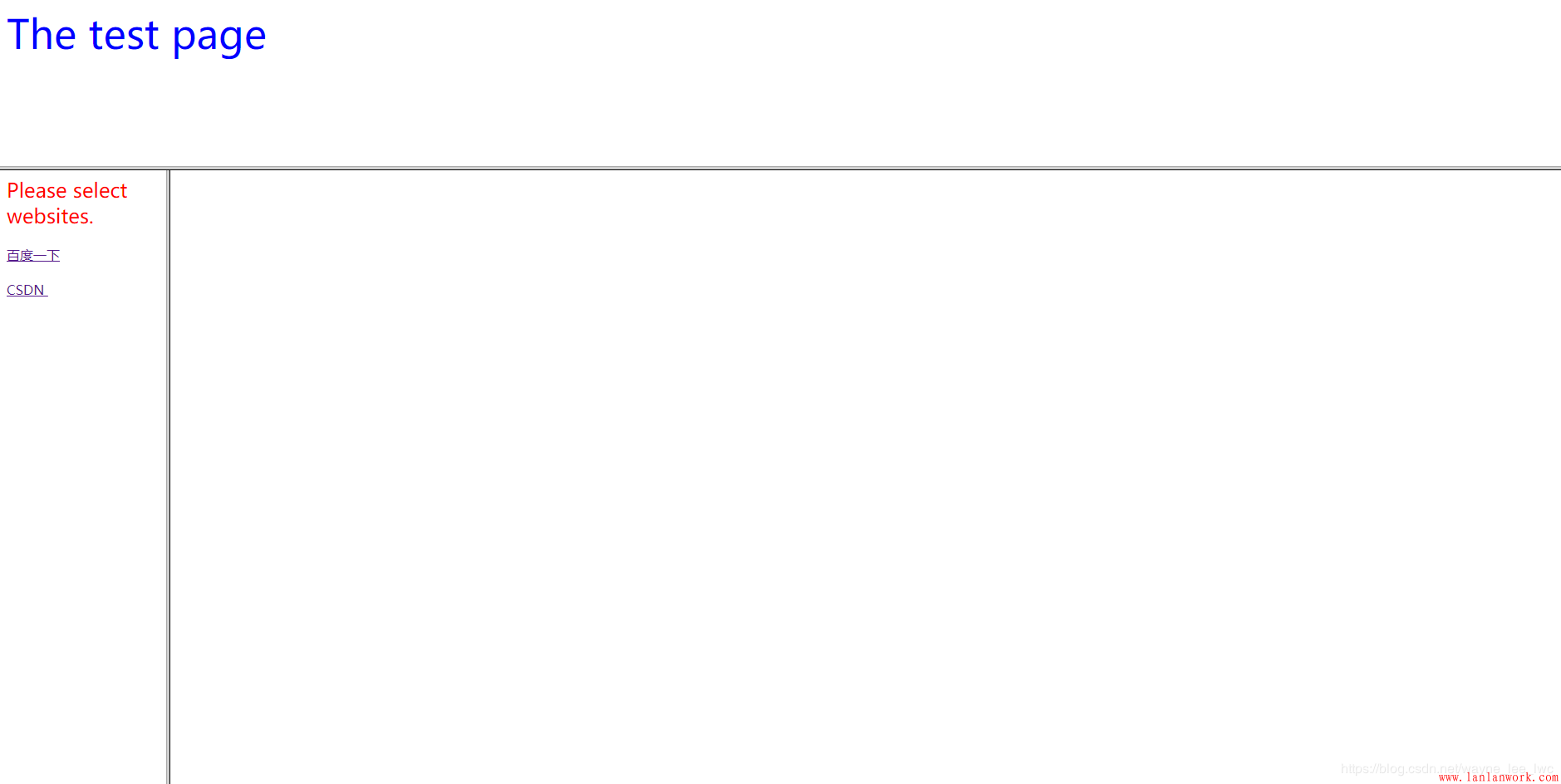 <html> <head></head> <frameset rows="500,*" border="3" noresize="noresize"> </frame> </html>看上面的代碼,用frameset替換掉body不難理解,畢竟我們約定做框架的網(wǎng)頁不具有實體內(nèi)容 接著,這里提到了框架標(biāo)簽的三個屬性,分別為: rows/cols 框架的分行或分列 border 分隔框的寬度 noresize 大小是否可調(diào) 現(xiàn)在來分別解釋一下 第一個,rows 或cols 屬性,代表了框架的分行或分列的情況,在引號內(nèi)書寫該屬性的值的時候,不需要指明分成幾欄,只需要指明每一欄占據(jù)的寬度或高度(單位為像素)并使用逗號隔開。瀏覽器在解析的時候會計算到底分成了幾欄。另外,不指定寬度而使其占據(jù)剩余位置時,可以使用通配符 “ * ”。 第二個,border 屬性,代表了分隔框的寬度,這是屬性的數(shù)值單位是像素。所以如果你不想加入邊框,則可以將它設(shè)置為零。 第三個,noresize 屬性,表示我們的框架的大小是否可調(diào),frameset標(biāo)簽?zāi)J(rèn)為大小可調(diào),當(dāng)用戶鼠標(biāo)移動到邊框上時,他可以拖拽改變大小。所以如果不想讓用戶隨意改變框架大小,那么可以選擇使用這個屬性 (當(dāng)然,也可以選擇把邊框的寬度設(shè)為零,讓他找不到)。 這個屬性的值同屬性名稱一樣。 最后還需要說明的是:框架集標(biāo)簽是可以進(jìn)行嵌套的,也就是說,在已經(jīng)分出來的框架中,我們可以借著分欄。 在框架內(nèi)鑲嵌網(wǎng)頁 剛剛我們使用 frameset 標(biāo)簽將網(wǎng)頁變成框架并劃分成了若干區(qū)域,每一個區(qū)域都是一個單獨的可顯示頁面的子網(wǎng)頁(筆者起的名)?,F(xiàn)在,我們需要在這些區(qū)域內(nèi)為它鑲嵌上一個網(wǎng)頁,這需要用到frame這個單標(biāo)簽在框架下添加網(wǎng)頁,它的寫法如下: <frame src="...." name="...." /> 1 這里可以看到 frame 標(biāo)簽的兩個屬性; src 和 name 。它們分別代表著添置連接(這是一個超鏈接,網(wǎng)頁,HTML文件,圖片等都是可以的。有關(guān)超鏈接的信息,可參照上一篇學(xué)習(xí)總結(jié)或者問問度娘 ),以及框架名稱。 框架的命名,很主要的一個原因在于可以重復(fù)利用一個框架,即在其他標(biāo)簽使用時,可以在某個框架上顯示相應(yīng)內(nèi)容。還記得上一篇中,我們提到的鏈接標(biāo)簽 target 屬性中的 “某框架名稱” 這個值嗎?在為框架命名后,就可以使用上述的 target 用法,將打開的網(wǎng)頁放在某個框架中了。 綜上,舉個例子: 先來創(chuàng)造一個帶有嵌套的框架<!--frame--> <html> <head></head> <frameset rows="200,*" border="5" noresize="noresize"> <frame src="title.html" name="title" /> <frameset cols="200,*"> <frame src="selection_bar.html" /> <frame name="output_page" /> </frameset> </frameset> </html><!--title--> <html> <head></head> <body> <font size="7" color="blue"> The test page </font> </body> </html>