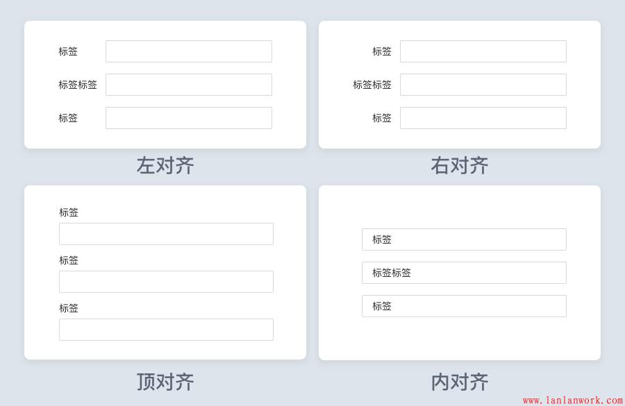 標(biāo)簽對(duì)齊方式有左對(duì)齊、右對(duì)齊、頂對(duì)齊、內(nèi)對(duì)齊,都有各自優(yōu)缺點(diǎn),不同場(chǎng)景酌情使用。