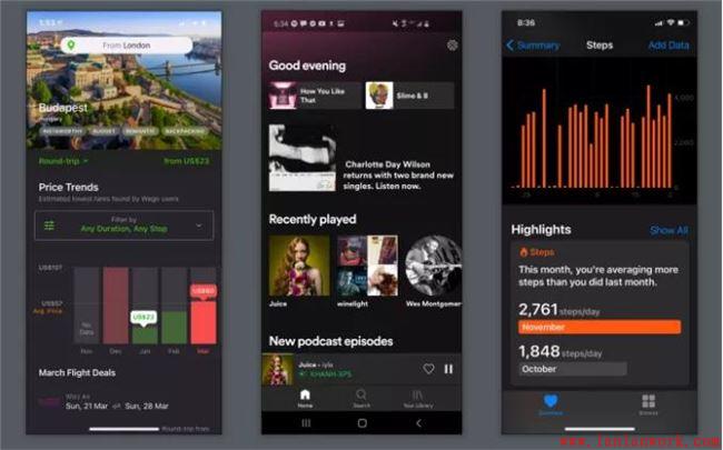 暗黑UI設(shè)計正確的手機應(yīng)用:Wego、Spotify和蘋果(Android和iOS)。