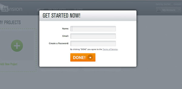 在對(duì)表單進(jìn)行了充分的簡(jiǎn)化之后,我們還可以試著通過(guò)一些設(shè)計(jì)技巧讓填寫表單的環(huán)節(jié)看上去更輕量。在這方面,我個(gè)人最喜歡的一個(gè)案例來(lái)自原型制作工具InVision的注冊(cè)表單。他們使用浮層的形式呈現(xiàn)表單,作為訪問(wèn)者,我可以感知到,當(dāng)我填寫完成之后就可以立刻回到之前的界面繼續(xù)應(yīng)用流程。