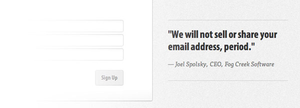 在為訪問(wèn)者提供積極引導(dǎo)的同時(shí),我們還要想辦法避免掉那些負(fù)面因素。人們?cè)谔顚懕韱螘r(shí)的最大顧慮就是信息被網(wǎng)站方收集之后的用途。用戶不會(huì)希望收到垃圾郵件,更不愿意自己的個(gè)人信息被傳播出去。如果你確實(shí)運(yùn)營(yíng)著一個(gè)值得信賴的產(chǎn)品,那么不妨直接讓用戶知道你不會(huì)把他們的信息販賣出去或是向他們發(fā)送垃圾郵件,就像FogBugz做的那樣,在注冊(cè)表單旁邊以非常直白的口語(yǔ)化的方式告訴用戶“我們不會(huì)出售或分享你的郵箱地址,就是這樣。”