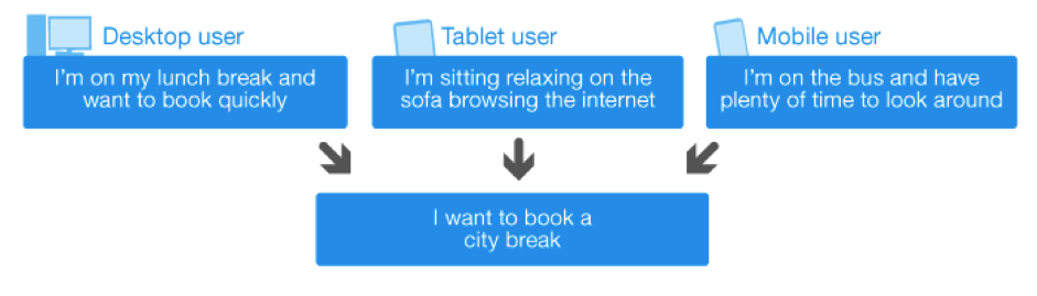過去,我們通常會假設(shè)用戶在使用移動設(shè)備訪問網(wǎng)站時,其行為都是高度目標(biāo)驅(qū)動化的,例如在旅途中獲取酒店地址、預(yù)訂房間一類。但實際情況不僅如此——智能手機、平板電腦等各類移動設(shè)備的用戶,會越來越多的在相對穩(wěn)定從容的狀態(tài)下使用網(wǎng)絡(luò)。所以在很多時候,用戶使用不同設(shè)備的目標(biāo)差別并沒有想象的那么大,我們不能片面的假設(shè)不同類型設(shè)備的用戶對功能的需求差異。