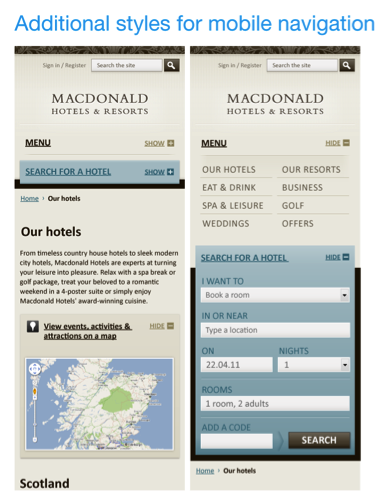 相比于傳統(tǒng)的Web視覺設(shè)計過程,在這里我們不僅要打造出風(fēng)格恰當(dāng)?shù)腢I元素,而且要根據(jù)前面制定下來的幾種規(guī)格方案,對某些關(guān)鍵性的UI元素進行樣式擴展或改造。例如下圖所示的酒店搜索模塊,正如我們前面提到的,在小屏幕版本中,最佳實踐方式是做成可展開和收起的模式,而這種交互方式在平板電腦或桌面設(shè)備中是不需要的。類似這樣情況,在視覺設(shè)計方面需要花些額外的功夫。