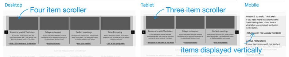 全局的四列等寬網(wǎng)格布局使其他組件的規(guī)劃也非常輕松。在首頁中有一個組件,其中包含若干內(nèi)容模塊。默認(rèn)尺寸下,可以并排顯示四個模塊;左右兩邊各有一個觸發(fā)滾動的按鈕,以點擊之后模塊列表會前后滾動,以顯示更多內(nèi)容。在平板電腦類型的布局中,默認(rèn)顯示的數(shù)量變?yōu)槿齻€;而在手機的小尺寸屏幕中,內(nèi)容模塊列表會變?yōu)閱瘟校⑷サ袅擞糜谧笥覞L動的按鈕,用戶可以上下滾動頁面,依次查看不同的模塊。