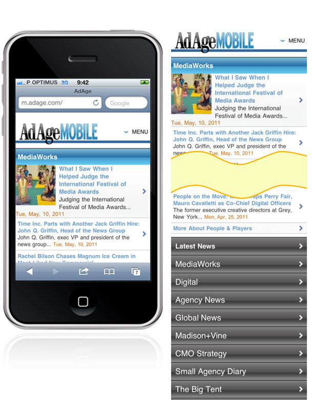 確實(shí)是這么回事。移動版本的站點(diǎn),在布局方面,應(yīng)該使主要內(nèi)容盡量多的占據(jù)著首屏當(dāng)中的空間,而導(dǎo)航結(jié)構(gòu)則應(yīng)該以某種縮略的形式出現(xiàn)在相對次要的位置。Wroblewski通過一個(gè)實(shí)例來倡導(dǎo)這個(gè)設(shè)計(jì)模式,也就是Ad Age的移動版站點(diǎn) 。其首屏當(dāng)中,除了網(wǎng)站標(biāo)題及內(nèi)容列表之外,右上角的菜單按鈕是界面當(dāng)中唯一一個(gè)交互控制元素。當(dāng)用戶點(diǎn)擊這個(gè)按鈕時(shí),導(dǎo)航列表才會出現(xiàn)在屏幕當(dāng)中??瓷先?,整個(gè)導(dǎo)航列表好像是另外一個(gè)界面,但它實(shí)際上是被放置在頁面最下方的,而菜單按鈕只是個(gè)錨點(diǎn)而已。